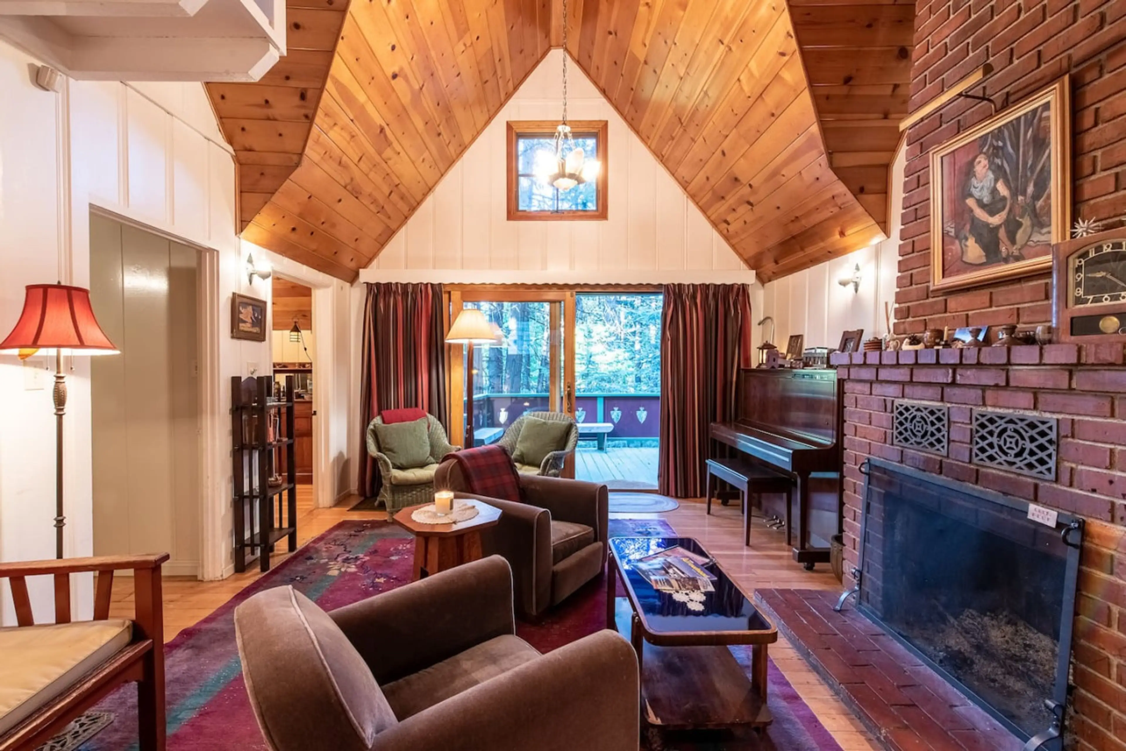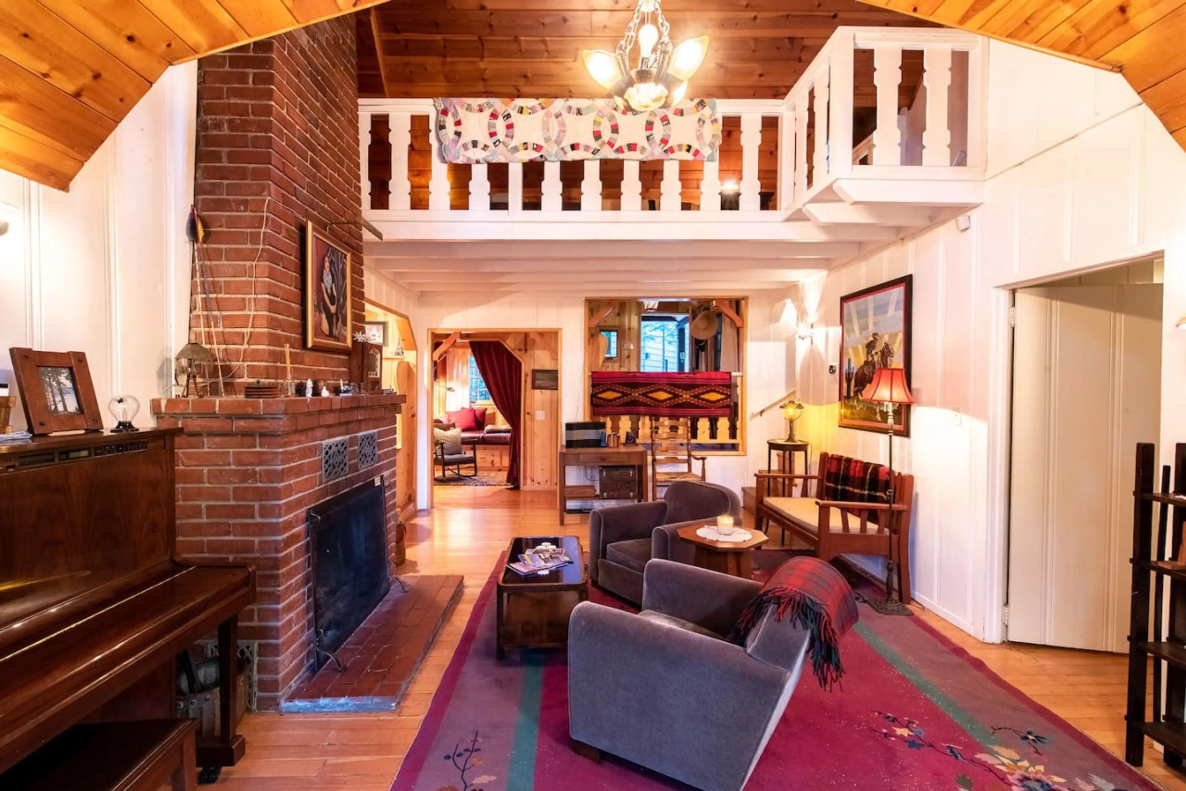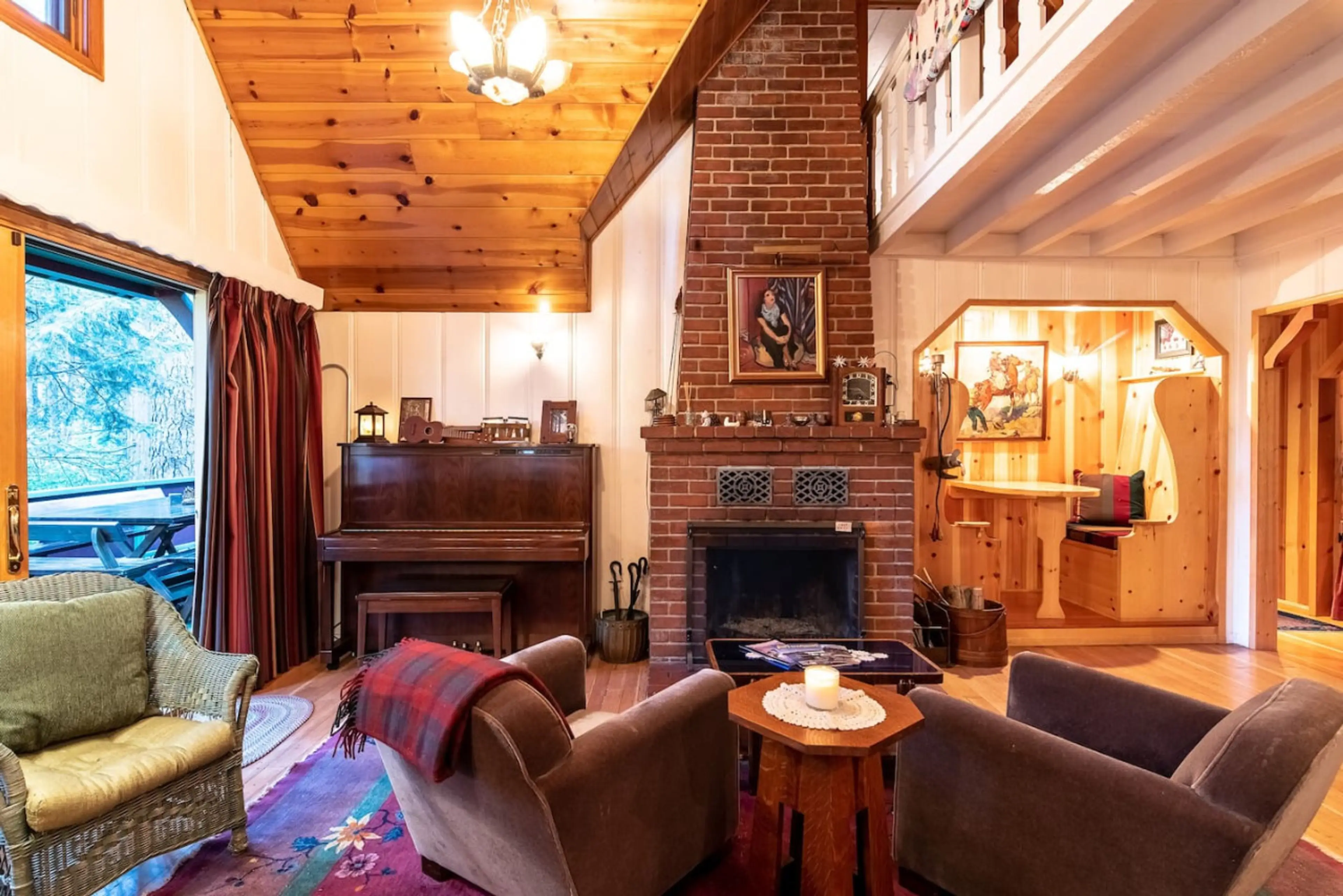 Highlights include the brick fireplace, player piano, heated bathroom floors, many cute nooks, and endless mood lighting options to enhance the cozy vibes.
